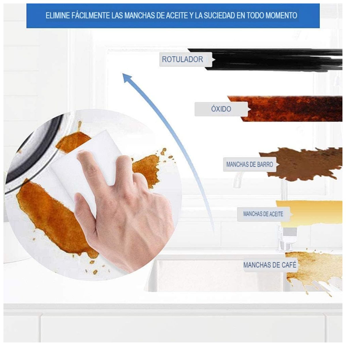 - Tecnología de Espuma de Melamina: Fabricada con espuma de melamina, un material de alta densidad que actúa como una lija ultrafina para remover suciedad.